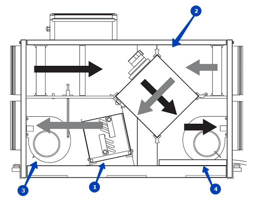 Un échangeur de chaleur rotatif cylindrique avec des plaques métalliques ondulées est placé dans le boîtier PVU. Pendant le fonctionnement, les compartiments sont remplis alternativement de flux d'air multidirectionnels.
