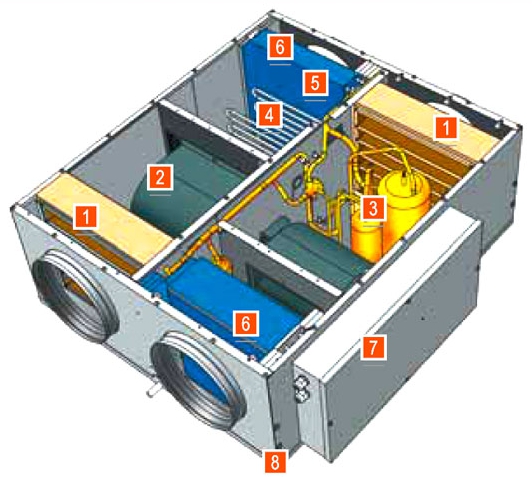 Le circuit contient une pompe à chaleur réversible - un circuit de fréon scellé rempli connecté à des échangeurs de chaleur sur les conduits d'échappement et d'admission.