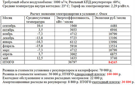 Connaissant les performances requises du système de ventilation et l'efficacité d'échange thermique de l'échangeur de chaleur, il est facile de calculer les économies sur le chauffage de l'air d'une pièce dans des conditions climatiques spécifiques. En comparant les avantages potentiels avec le coût d'achat et d'entretien du système, vous pouvez raisonnablement faire un choix en faveur d'un récupérateur ou d'un aérotherme standard.