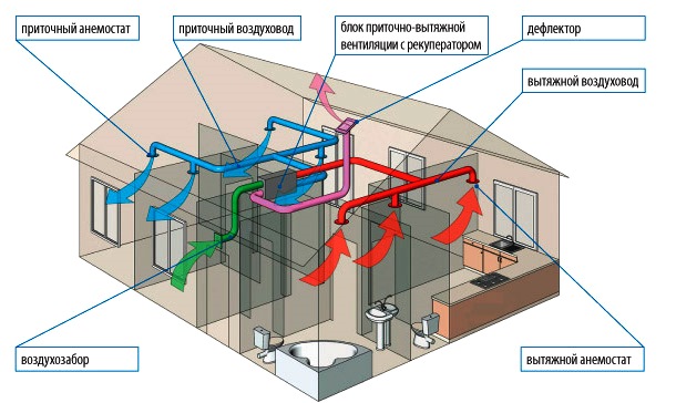Le système ventilation dans la maison peut être étendu à n'importe quelle échelle souhaitée et fournit, en cas d'urgence dans la pièce, un remplacement assez rapide de tout le volume de masse d'air. Que se passe-t-il à l'aide de ventilateurs puissants, de radiateurs, de filtres et d'un système de tuyauterie complet.
