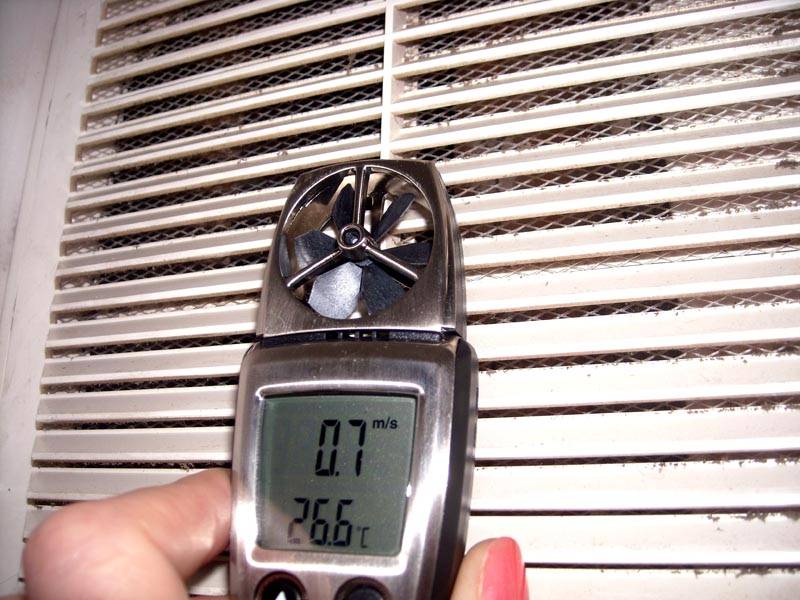 L'appareil est amené sur la grille de ventilation à une distance spécifiée dans les instructions. Après quelques secondes, l'indicateur de débit d'air (V) Après avoir fixé le chiffre reçu, il est nécessaire de calculer le volume d'air passé dans le système selon la formule: