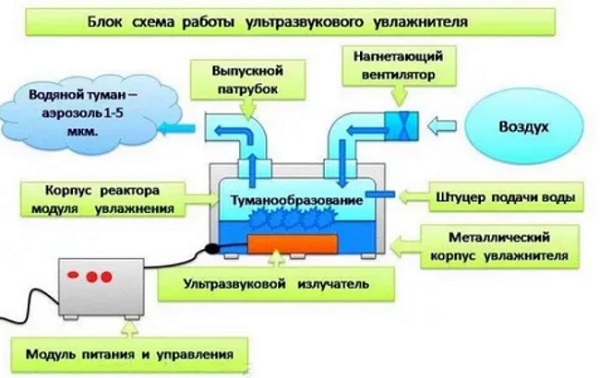 Extérieurement, il semble que l'eau bout dans l'humidificateur, mais la vapeur sortante est froide. Selon l'équipement, le fonctionnement de l'appareil peut différer légèrement - des étapes supplémentaires sont ajoutées (nettoyage, ozonation, aromatisation, etc.).