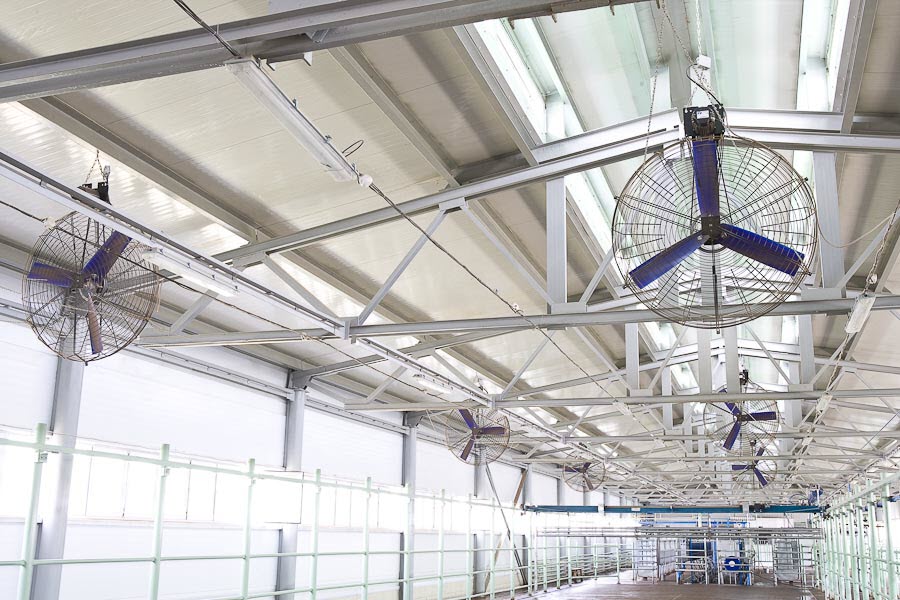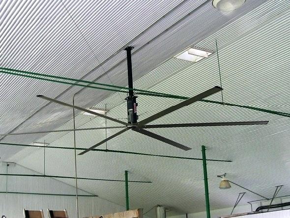 Les ventilateurs de plafond sont installés dans des étables avec 50 têtes ou plus. La conception des appareils est assez grande, les pales sont capables de déplacer de grands flux de masses d'air et de répartir uniformément l'air frais à l'intérieur de la structure.