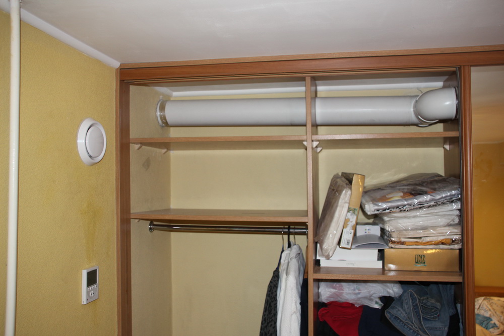 Une telle disposition du dressing, lorsqu'une seule pièce est une pièce adjacente, ne permettra pas de raccorder la ventilation d'alimentation et d'évacuation. Actuellement, ce problème peut être résolu en installant une vanne d'alimentation dans le mur.