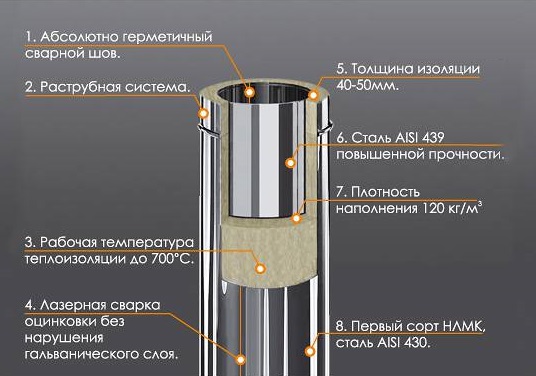 Le basalte est chimiquement inerte et ne réagit pas avec les métaux - le risque de rouille est réduit à zéro. Le choix d'un tuyau sandwich pour la ventilation d'échappement dépend des conditions de fonctionnement.