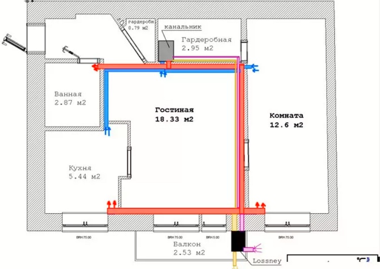 Maintenant, la tâche consiste à distribuer les threads. La hotte sera composée de quatre canaux: deux dans la cuisine et un dans la salle de bain et la salle de bain.