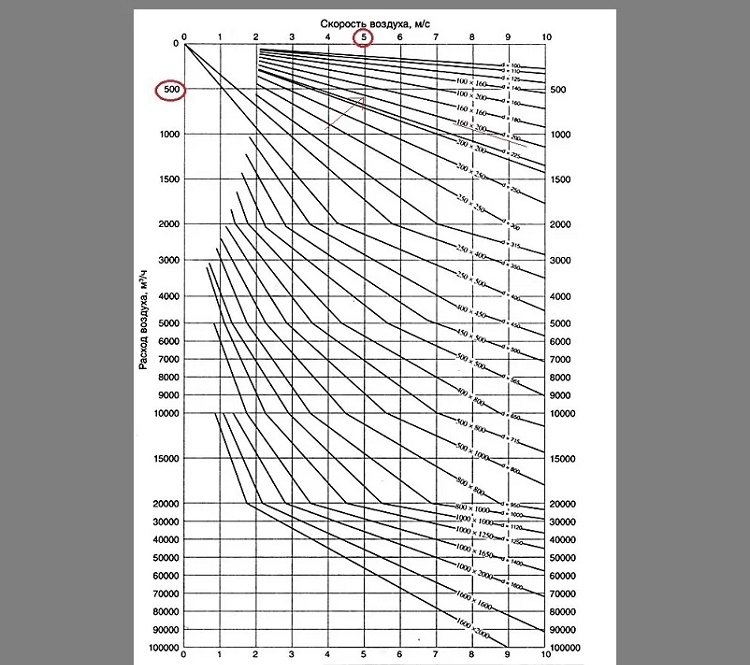 Vous pouvez sélectionner les conduits d'air selon des diagrammes spéciaux avec deux axes de coordonnées: débit d'air et vitesse de transport aérien. À l'intersection des perpendiculaires à ces valeurs, les valeurs de son diamètre se trouvent le long du conduit en béton.