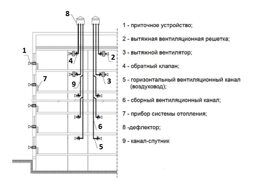 Dans les maisons typiques, le processus de changement d'air est effectué en mode naturel. L'afflux de masses d'air frais se produit dans les appartements, le fluide d'échappement est évacué par des puits de ventilation équipés de canaux satellites.