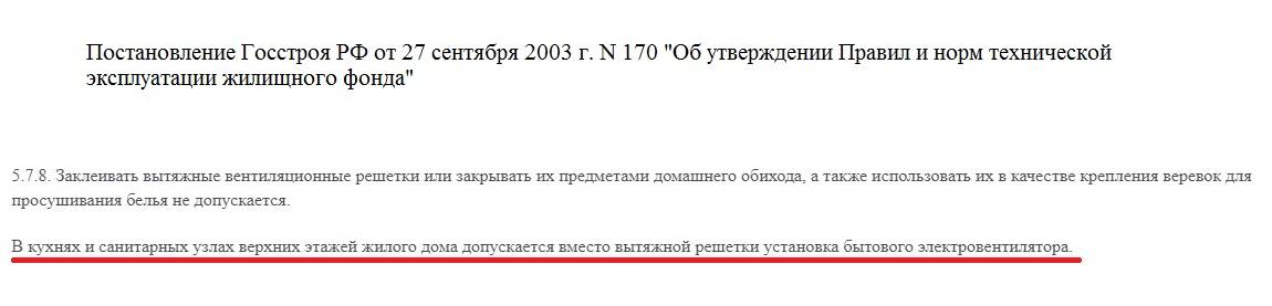 Concernant l'extraction forcée, il y a aussi quelques lignes qui permettent l'installation uniquement ventilateurs dans les salles de bain, cuisines des appartements supérieurs des tours d'habitation (capture d'écran ci-jointe). Il s'avère que l'installation d'un parapluie équipé d'un ventilateur est inacceptable. La prochaine inspection de l'appartement par le représentant du Code pénal se terminera par le démontage du parapluie.