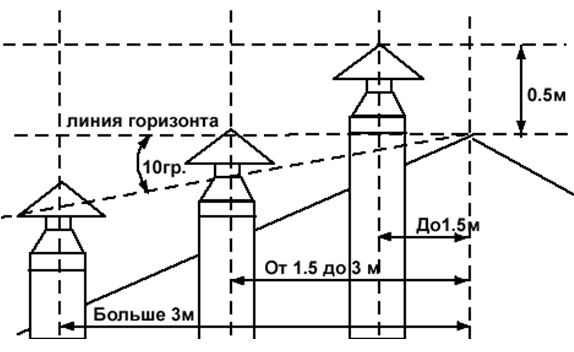 Nous attirons l'attention sur la nécessité d'élever le bandeau de la hotte, équipé d'un déflecteur, sur le plan du toit d'un demi-mètre ou plus. Les conditions d'emplacement en termes de proximité de la crête de toiture, telles que discutées dans le diagramme ci-dessus, s'appliquent également.