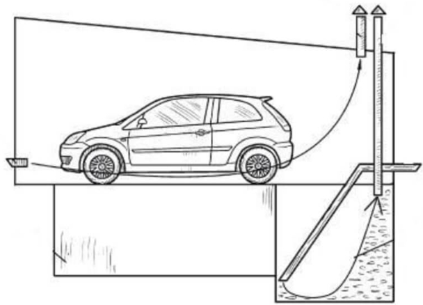 L'air frais est filtré avant d'entrer dans les conduits d'air et, pendant la saison froide, est chauffé. Sa soumission au garage s'effectue par les canaux d'air à travers les trous pratiqués par les grilles, pratiqués dans le sol ou dans les murs presque au ras du sol, ainsi que dans les parois de la fosse d'inspection.