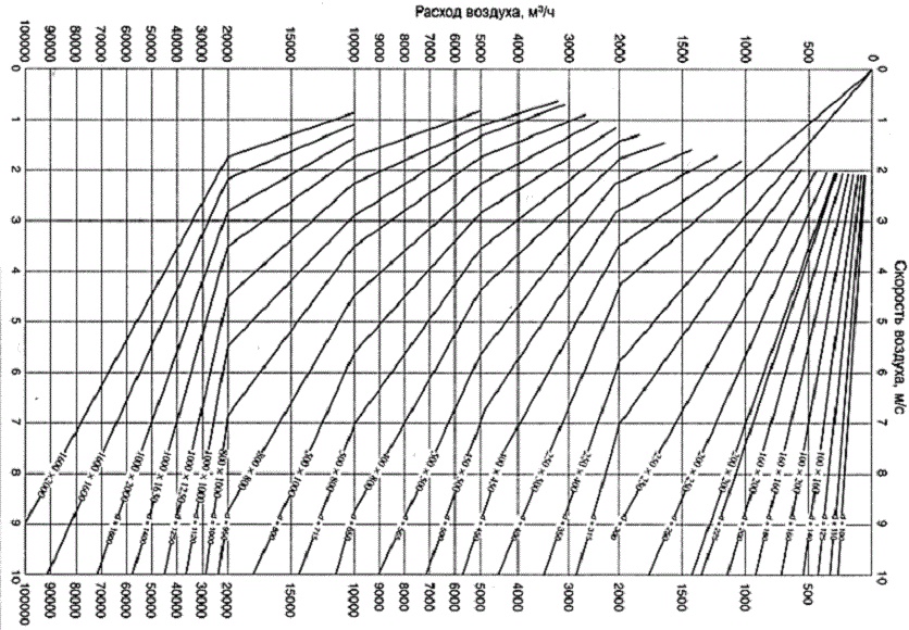 Ensuite - nous regardons l'image du diagramme du diamètre des conduits d'air et sélectionnons le paramètre approprié.