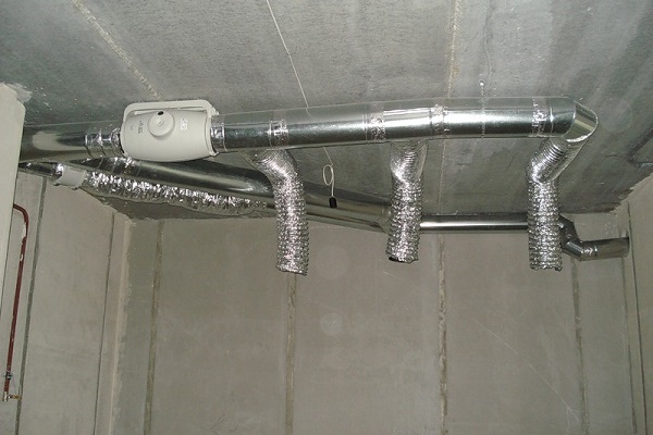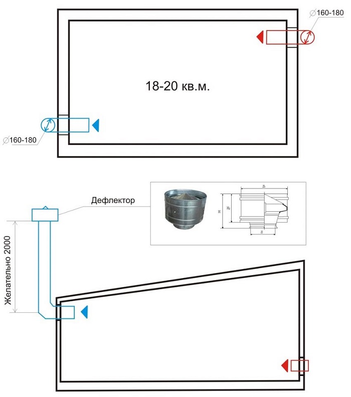 Le système de ventilation combiné est complètement similaire au système d'échange d'air naturel. La même disposition des conduits d'alimentation et d'échappement, la même section transversale des tuyaux d'air et le déflecteur à l'extrémité supérieure du conduit d'échappement sont utilisés.