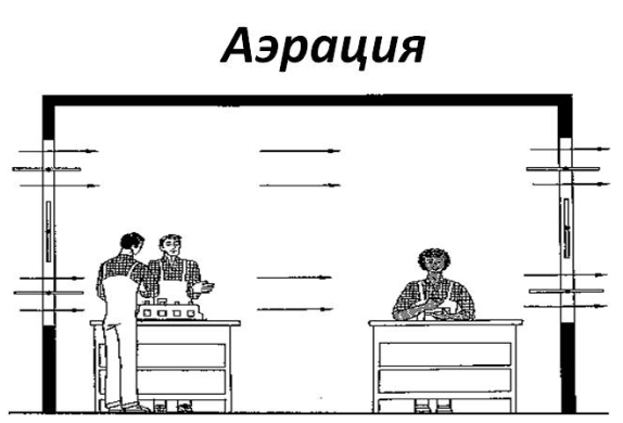 Dans les ateliers où la technologie permet la formation de chaleur en grande quantité, l'aération implique un échange d'air à travers des lampes légères et des ouvertures de fenêtre sous l'influence de la température et de la pression du vent. Dans les chambres froides, l'assimilation de l'air se produit uniquement sous la pression du vent.
