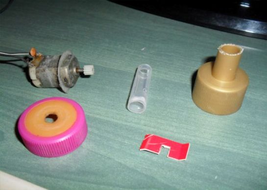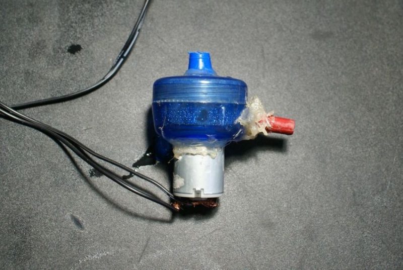 Pour fabriquer une petite pompe de faible puissance, dont le processus d'assemblage est donné dans l'exemple, vous devez faire le plein d'une bouteille en plastique de 5 litres, d'un boîtier d'un vieux stylo-feutre et d'un moteur qui peut être retiré d'un ancien lecteur de DVD.