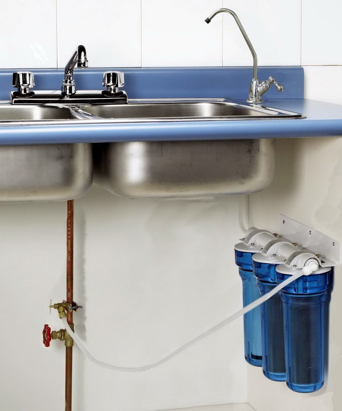 Chacun d'eux a une cartouche filtrante. Le système de nettoyage est fixé à l'alimentation en eau à l'aide d'un eye-liner flexible. Une structure est installée sous l'évier et l'eau coule à travers le robinet du lavabo. Nettoie un tel filtre exclusivement à l'eau froide.