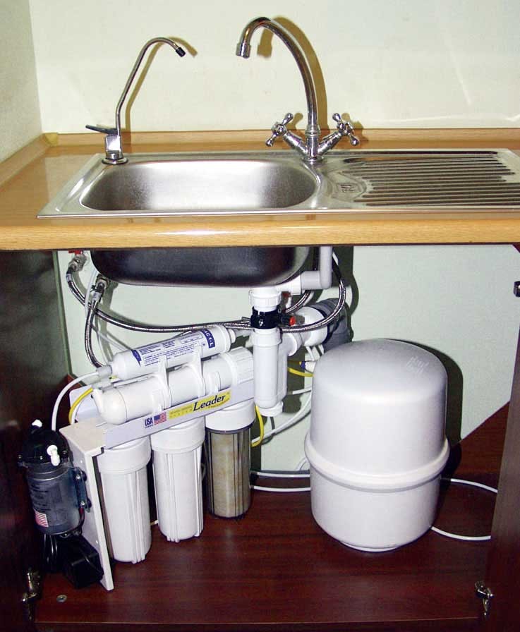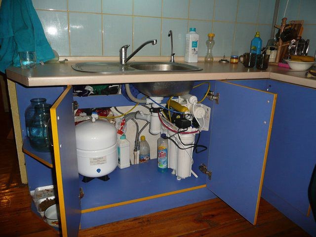 Filtres à osmose inverse pour la purification de l'eau, installés sous l'évier, plus volumineux et plus chers. Cela est dû au fait que deux éléments supplémentaires sont fournis dans la conception: réservoir de stockage et membrane d'osmose inverse.
