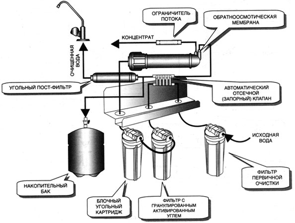 Ainsi, le système d'osmose inverse est un ensemble d'appareils qui permettent d'obtenir de l'eau potable avec un haut degré de purification. Jusqu'à récemment, ces systèmes étaient principalement utilisés dans l'industrie, dans les établissements publics de restauration dans les établissements de santé, etc.
