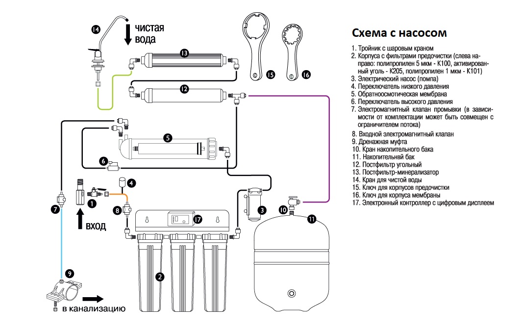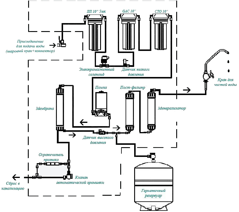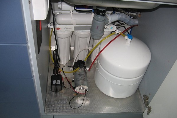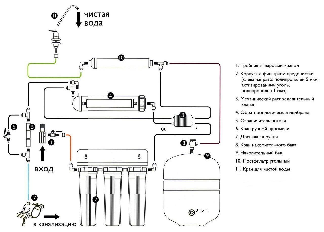 La variété des systèmes d'osmose inverse est très large. Par conséquent, une installation supplémentaire du filtre sera envisagée sur l'exemple du plus courant - avec un réservoir de nettoyage et de stockage en cinq étapes.