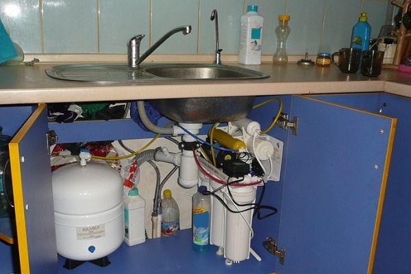 Traditionnellement, le système est installé au même endroit que filtres ménagers - sous l'évier. Les dimensions du réservoir de stockage et de l'unité de filtration permettent de le faire. Avant de commencer le travail, vérifiez la conformité du système avec les paramètres entrants.
