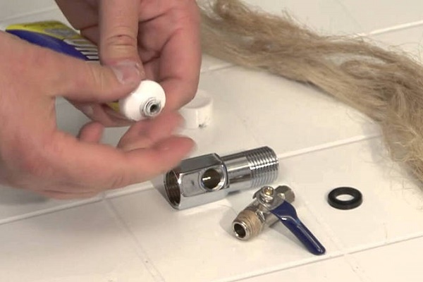 Le réservoir lui-même doit être préparé avant l'installation - un robinet en plastique doit être fixé au raccord fileté. Du ruban FUM en deux ou trois couches est enroulé sur le filetage du réservoir de stockage.