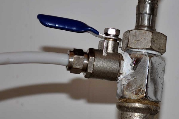 Tout d'abord, bien sûr, il est nécessaire de couper l'alimentation en eau froide.Le raccordement à l'alimentation en eau s'effectue à l'aide d'un adaptateur adaptateur. L'endroit le plus pratique pour son installation est la connexion d'un tuyau d'eau et d'un eye-liner flexible pour un robinet de cuisine.