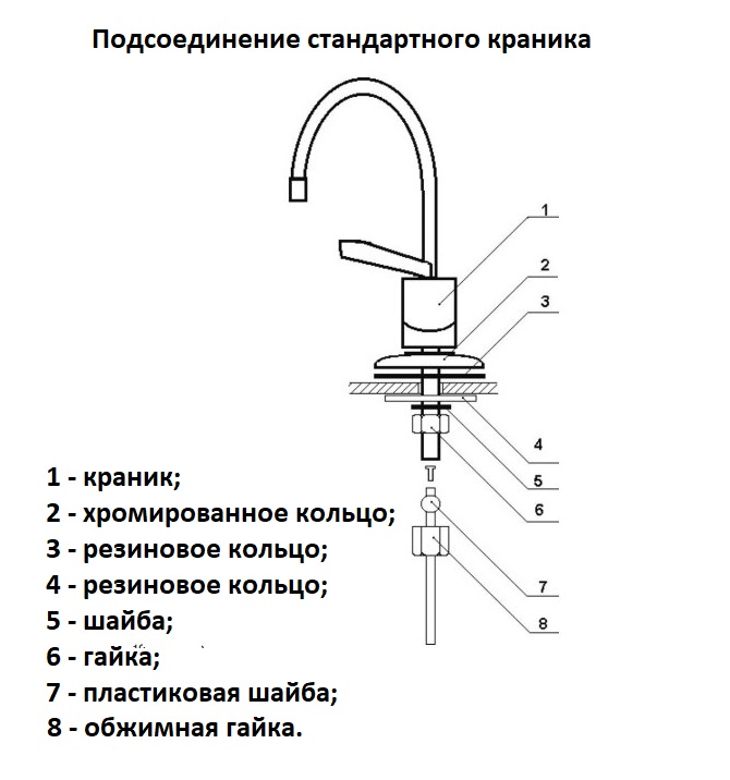 - Assemblage La base inférieure de la grue est insérée dans le trou, un caoutchouc, du plastique, puis une rondelle métallique est placée dessus. La structure résultante est serrée avec un écrou à l'aide d'une clé ou d'une clé à pipe à 14.