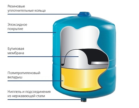 Le réservoir de stockage résout complètement le problème. Une quantité suffisante d'eau propre y est stockée, qui est constamment renouvelée à mesure que le liquide diminue. Après le vase d'expansion, l'eau peut être fournie directement au robinet pour l'eau potable, mais cela se fait rarement.