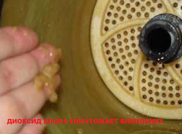 Il existe un outil spécial pour retirer le film des micro-organismes dans les membranes, appelé Dutrion, à base de dioxyde de chlore. En fait, c'est un gaz dissous dans l'eau, qui pénètre sans problème à travers les pores de la membrane et détruit complètement le biofilm des micro-organismes et des algues. La substance est neutre vis-à-vis des matériaux dont sont constituées les membranes et sa concentration dans l'eau est minime et non nocive pour l'homme.