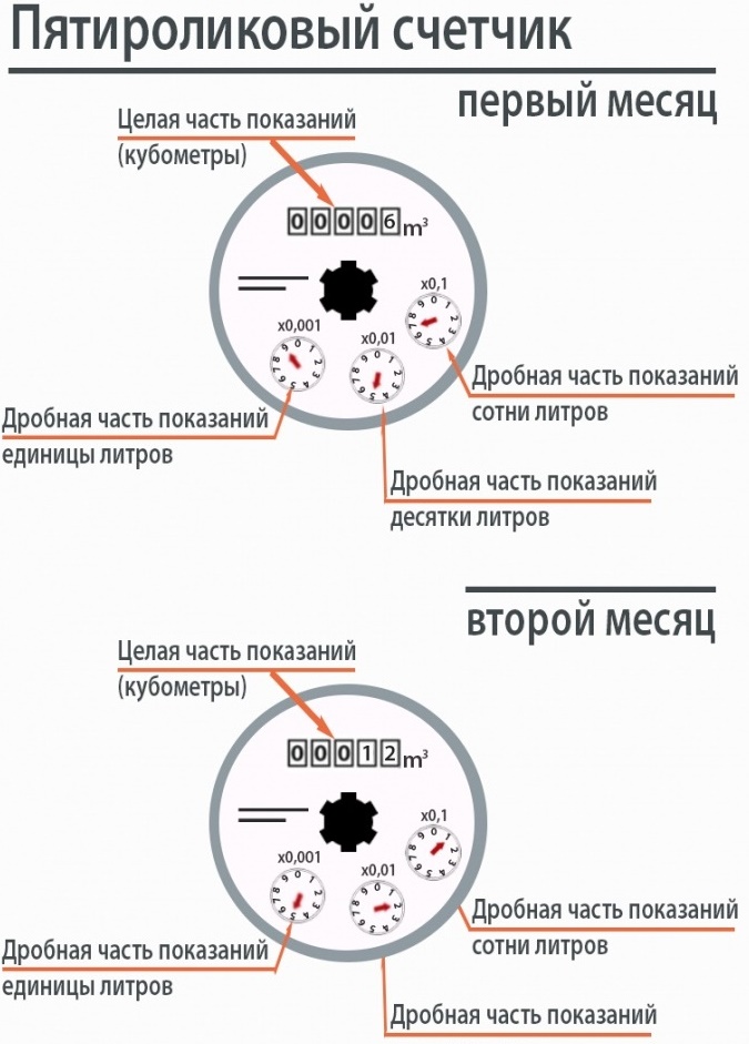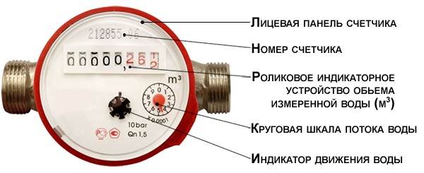 Le panneau avant de certains compteurs d'eau est représenté par des indicateurs combinés: numérique (rouleau) et flèche. L'échelle numérique comporte également cinq chiffres, ce qui signifie la totalité des mètres cubes d'eau consommés.