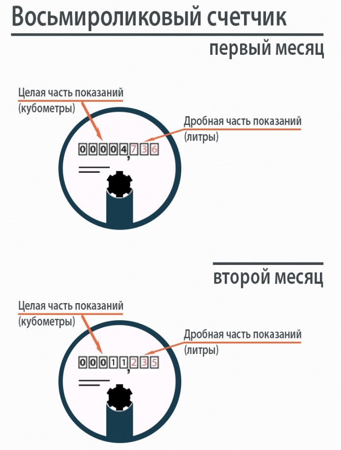 La partie fractionnaire des lectures de l'appareil, avec une indication de huit rouleaux, peut être ignorée ou arrondie selon les règles des mathématiques. Avec une valeur de plus de 499 litres - dans une direction plus petite, avec des nombres supérieurs à 500 litres - dans une plus grande.