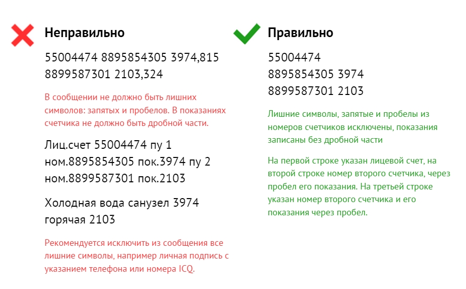 La plupart des fournisseurs recommandent aux consommateurs de partager les données de consommation d'eau au cours de la seconde moitié du mois. Par exemple, les Moscovites se voient attribuer une période allant du 15e jour du mois en cours au 3e jour du mois suivant le mois de déclaration pour saisir le témoignage des compteurs d'eau.