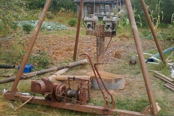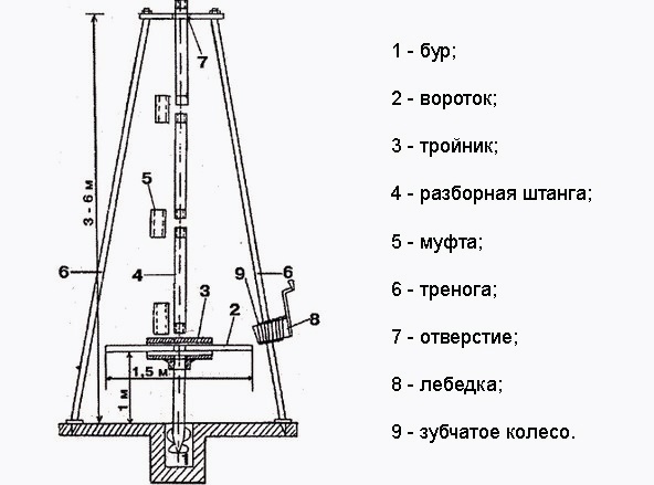 Dans le premier cas le forage est en cours avec un projectile étroit et lourd appelé broyeur. Il est suspendu à une corde ou un câble, qui est projeté sur un bloc monté sur un trépied. Un treuil avec un moteur est utilisé pour tirer une perceuse de la mine, mais cela peut également être fait manuellement si vous le souhaitez.