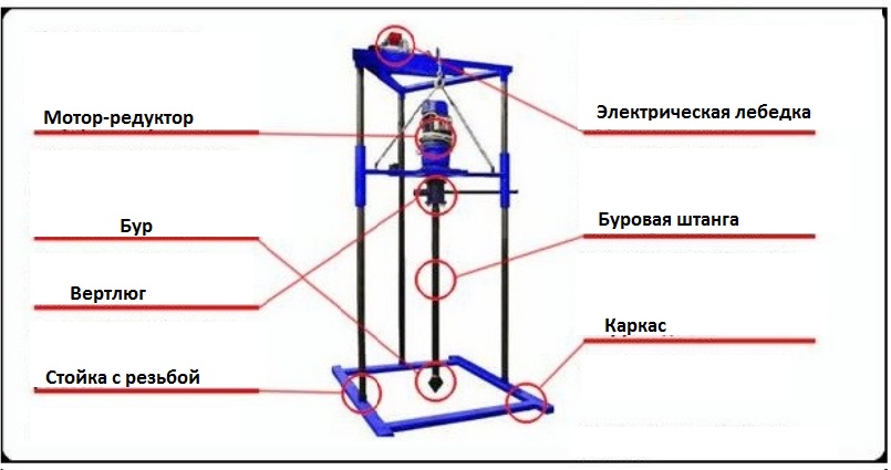 Le cadre d'une telle installation peut être réalisé sous la forme d'un trépied, mais le plus souvent il est constitué de guides verticaux montés sur un support et reliés par le haut par une structure horizontale. Le châssis de la machine doit maintenir fermement la colonne de travail percer et des tiges empilables pour les retirer de leur puits.