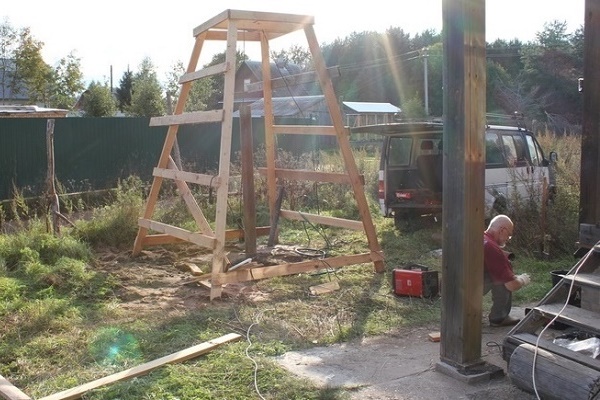 Trépied avec écope - le design est simple, comme tout ingénieux. Ses dimensions peuvent être estimées "à l'oeil", en particulier des calculs d'ingénierie précis ne sont pas nécessaires ici. Par exemple, la hauteur du trépied sur lequel la bobine sera fixée devrait être environ un mètre plus grande que cette perceuse.