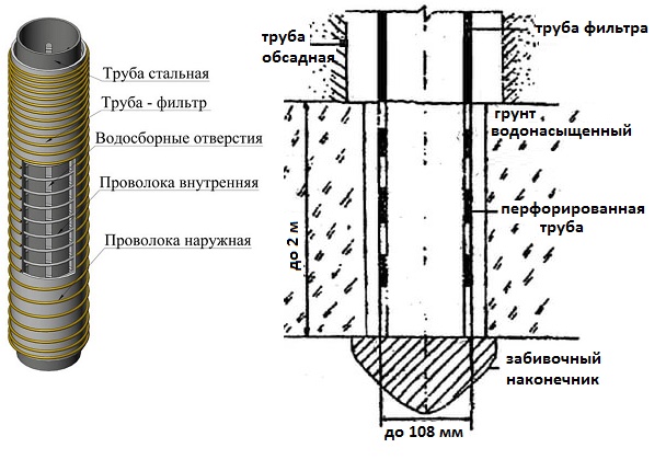 Si un large puits a été foré pour l'installation ultérieure d'une pompe submersible, alors il faut faire attention dispositif de filtrage. Pour cela, un autre diamètre, plus petit, est inséré dans le boîtier.