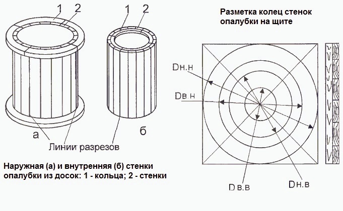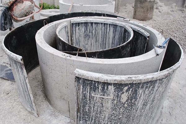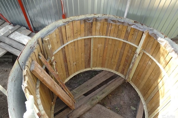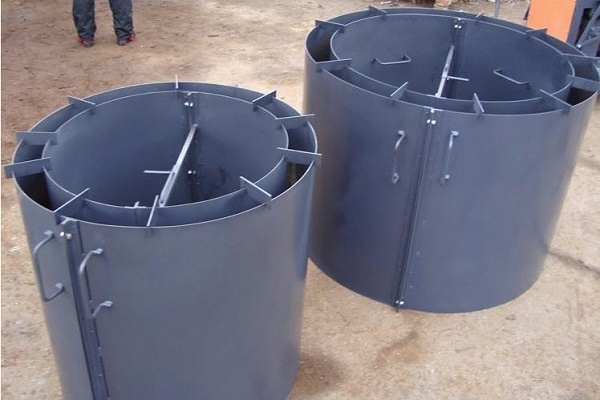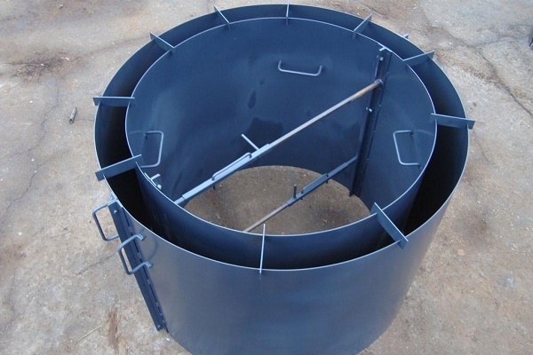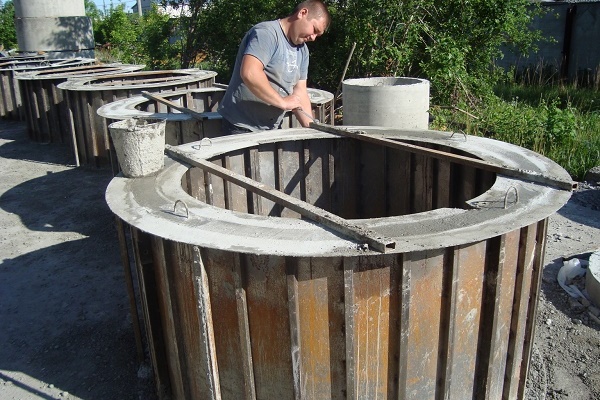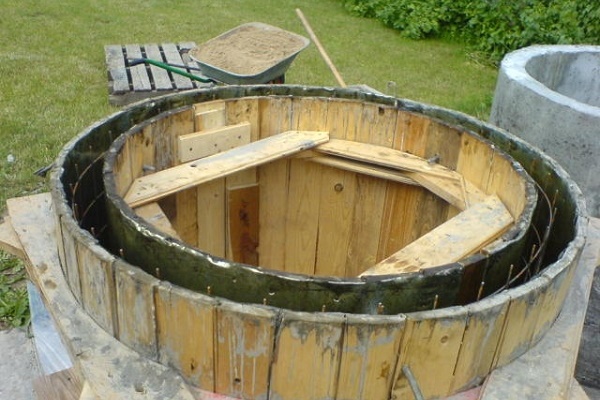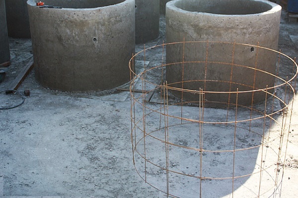 La technologie de construction est similaire à la méthode précédente, mais compliquée par la procédure de fabrication des anneaux en béton. Pour ce faire, il est nécessaire de s'approvisionner à l'avance avec un coffrage pliable en planches ou tôles interconnectées en une seule toile.
