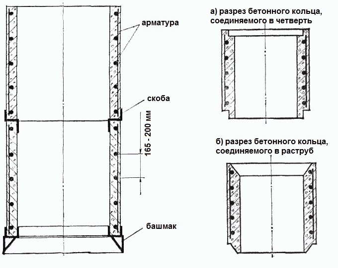 De plus, l'épaisseur de la paroi de l'anneau en béton pour la construction du puits doit être d'au moins 10 cm, meilleure que 12 cm.Et lors de l'utilisation d'anneaux en béton armé, un minimum de 6 cm est autorisé, mais l'épaisseur moyenne est de 7 à 8 cm.