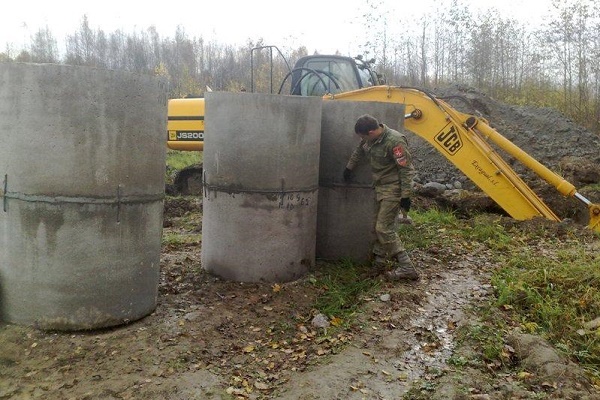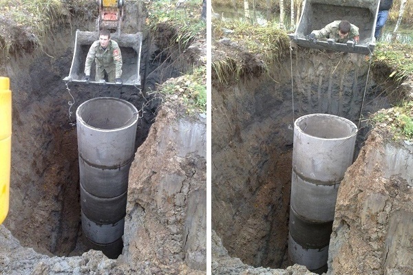 Au lieu du vieux puits, dans lequel la maison en rondins s'était complètement dégradée, ils ont décidé d'abaisser les anneaux de béton. La structure en bois a été démontée manuellement et les liaisons en béton armé ont déjà été installées à l'aide d'un équipement de levage. Un mélange ciment-sable a été appliqué à l'extrémité de chaque anneau; en outre, ils ont été fixés ensemble avec des plaques métalliques. La mine s'est avérée fine, assez solide, mais le puits est peu profond, l'eau y est boueuse, pas pour boire.