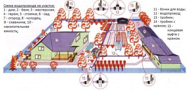 Les mesures de construction spécifiques (par exemple, la nécessité de creuser une tranchée), les méthodes d'installation des tuyaux, le choix de l'équipement technique, etc. dépendent du choix du schéma. N'oubliez pas que l'aménagement paysager d'été comprend les communications menant à la cuisine d'été, aux lits ou à la plantation de jardin - des endroits qui ne sont pas inclus dans le projet d'approvisionnement en eau en hiver.
