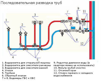 Le circuit série se compose d'une autoroute commune (colonne montante), à partir de laquelle les tuyaux vont aux mélangeurs, aux équipements de douche, etc. Si une alimentation en eau chaude est nécessaire, deux réseaux parallèles doivent être démarrés - avec de l'eau chaude et de l'eau froide. Pour connecter les tuyaux de dérivation, des tés sont utilisés.