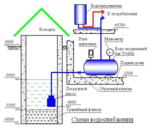 Le dispositif d'alimentation en eau, en revanche, est monté dans la partie inférieure du bâtiment - au sous-sol ou au sous-sol, de sorte qu'il est plus pratique de communiquer avec l'équipement de pompage situé dans le puits.