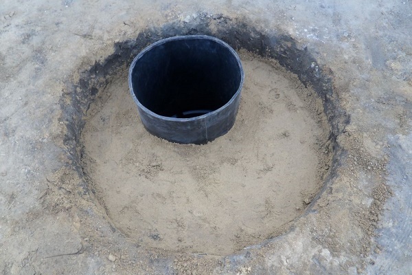 La technologie n'est pas très différente de l'installation bien sonne. Seulement à une profondeur beaucoup plus faible. Les anneaux sont fixés ensemble par des plaques d'acier - en cas de déplacements de sol.