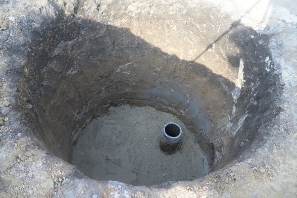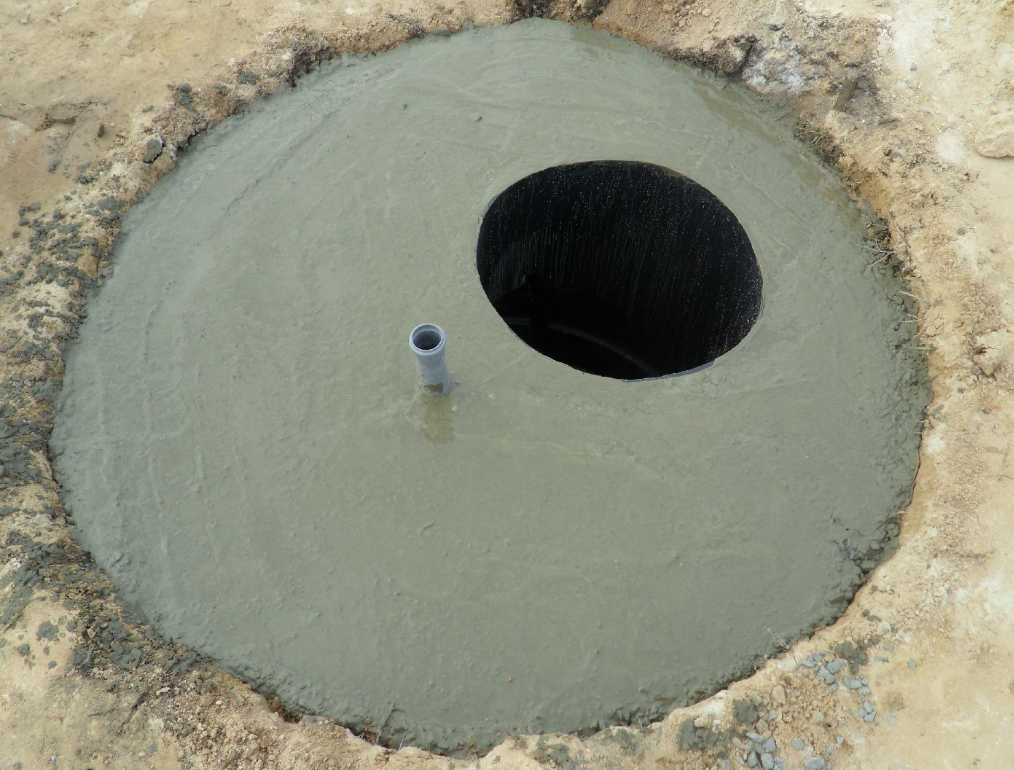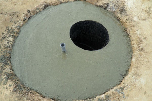 Comme déjà mentionné, le tubage du puits est coupé pour refléter la hauteur future du fond de la chambre. Le fond de la fosse est fermé avec un tampon de sable de 20 à 30 cm d'épaisseur et le remplissage de sable est renversé avec de l'eau pour le compactage. Une dalle de béton avec armature en treillis d'acier est coulée sur le dessus de l'oreiller.