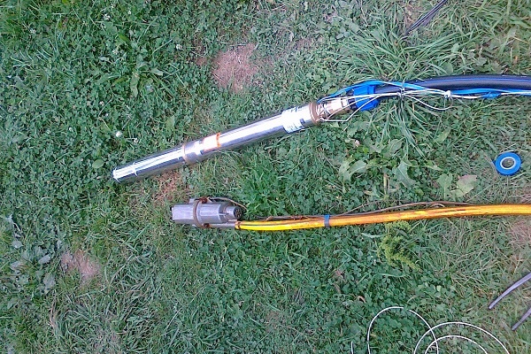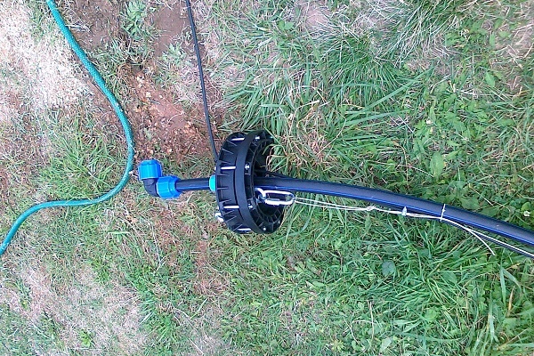 Une fois l'assemblage du système terminé, à une profondeur donnée abaisser la pompeet l'extrémité du tuyau est coupée. Ce travail est plus pratique à réaliser avec un partenaire: le premier immerge la pompe, le second - maintient l'équipement et redresse le tuyau.