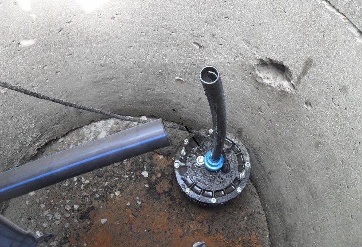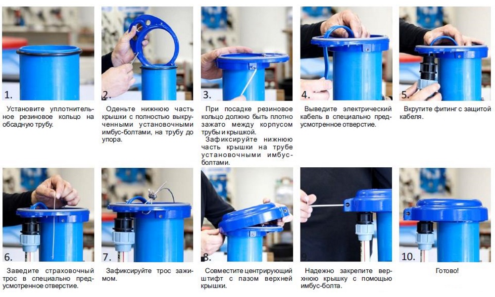Lorsque vous abaissez la pompe dans le puits, vous devez libérer progressivement le câble. Lorsque l'équipement est à la profondeur sélectionnée, le couvercle est fermé et le poids de la pompe le presse contre la bride. Le mastic tombe ensuite dans une rainure spéciale et est pressé fermement contre le boîtier, ce qui garantit une étanchéité fiable de la structure.