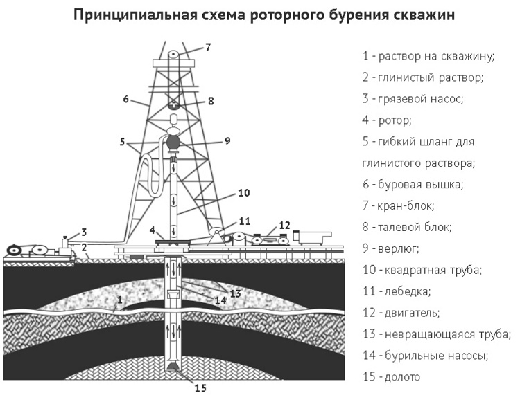 Le forage rotatif se caractérise par une diminution progressive du diamètre du puits à forer. En d'autres termes, le puits de plus grand diamètre est d'abord foré, puis craps tuyau, et l'espace annulaire entre la surface extérieure du tuyau et la paroi du puits à travers des trous technologiques sont remplis de mortier de ciment.