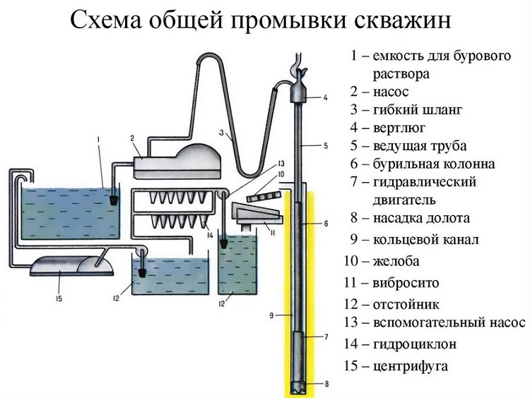 L'eau pénètre dans la face à travers les trous technologiques dans le trépan, "ramasse" la roche concassée puis par gravité à travers le puits annulaire espace par rapport à la tige de tête) pénètre dans la surface, où il pénètre dans le complexe de nettoyage (tamis vibrant, hydrocyclone).