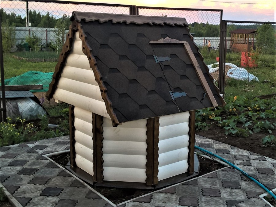 Les entreprises de construction offrent des structures de puits prêtes à l'emploi de différentes tailles et styles. Le prix d'une telle maison est influencé par le matériau de fabrication, la complexité du design, la présence d'éléments décoratifs. Ainsi, la maison la plus simple faite de doublure et de carton ondulé coûte de 7000 roubles, les maisons en bois, la maison en blocs avec des tuiles sont estimées à 35000-60000 roubles et les auvents d'élite avec des éléments sculptés à la main coûtent en moyenne 90000 roubles.