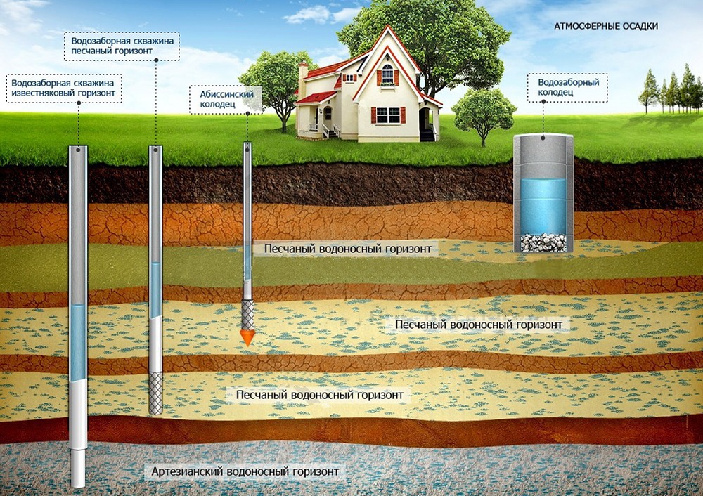 Il peut y avoir plusieurs aquifères dans la terre, et ils alternent avec des couches résistantes à l'eau. Pour extraire l'eau des premier et deuxième horizons sableux puits abyssiniens - des puits de petit diamètre qui, lors de l'installation, ne forent pas, mais percent les couches de sol avec une tige de pouce, comme une aiguille.